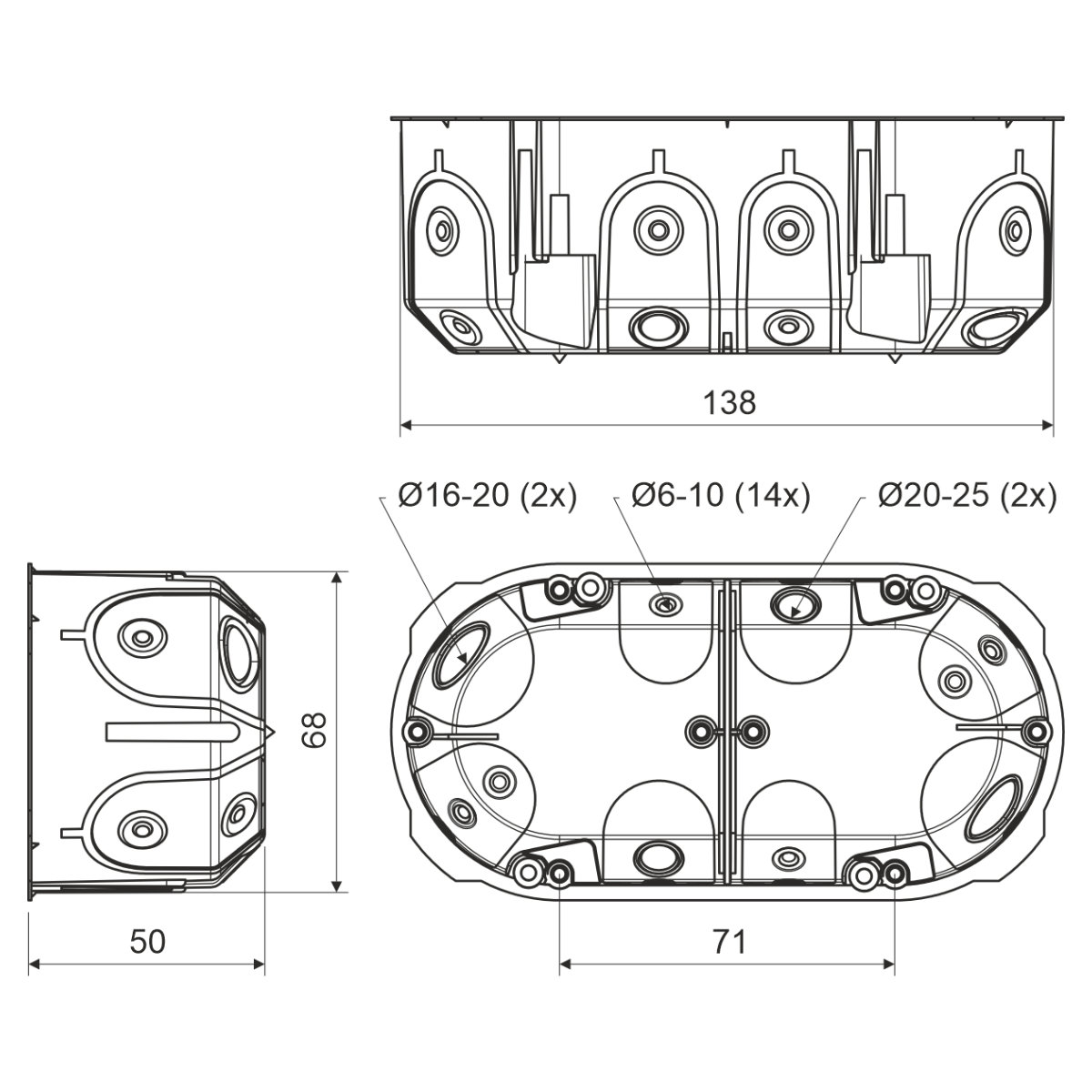 Безгалогенная конструкция коробки в полые стены с двойным впрыском для использования в средах с повышенной потребностью в защите людей и имущества. Отличная жесткость и простая форма упрощает монтаж устройств. Входные отверстия выполнены из упругого материала. Монтаж кабеля или трубы производится путем прокалывания мембраны и вставки кабеля или трубы в отверстие. Герметичность проходки обеспечивается. Мембрана предотвращает прохождение потока воздуха через установку. Подходит для энергосберегающих или пассивных домов. На внешней стороне есть два штифта, обозначающих точки сверления. Коробка отвечает требованиям, предъявляемым к установкам в звукоизоляционных стенах с шумопоглощением до 69 дБ. Крепежные винты имеют двойную резьбу для быстрого монтажа. Монтаж коробки в отверстие стены производится путем закручивания крепежных винтов. Коробка, оснащенная соответствующей крышкой, или устройство с защитой более или равным IP30 соответствует стандарту IP30. Защищен европейским промышленным образцом. Зенковать край гипсокартона при монтаже не нужно.