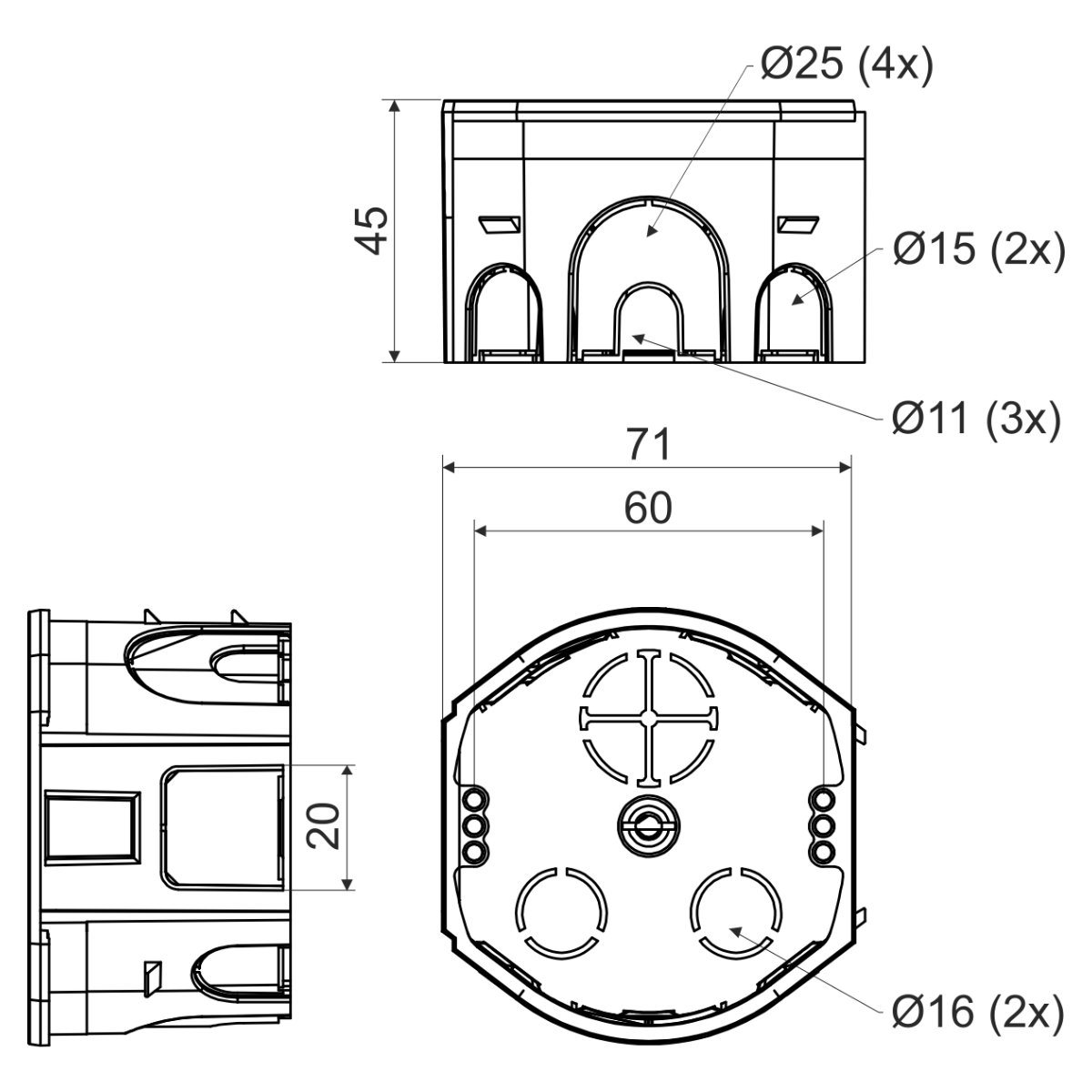 Возможно соединение в непрерывный ряд с расстоянием 71 мм. Коробки подключаются к KPR 68-70, KP 68/D, KPR 68/D, KP 68-30 и KP 68-45. Больше места для электроинсталляции. Защищен европейским патентом и товарным знаком. Прямая замена коробки KU 68-1901.