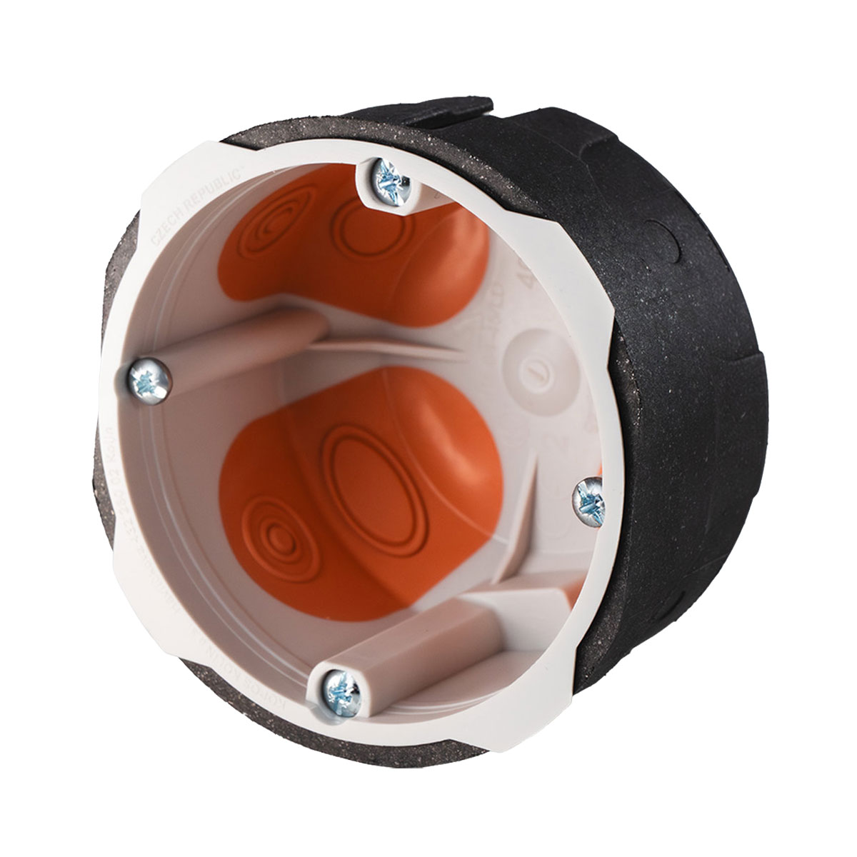 Универсальный огнестойкий подрозетник KPZ 68-45_PO — одинарный, безгалогенный, предназначен для надежной установки в зданиях с повышенными требованиями к безопасности.