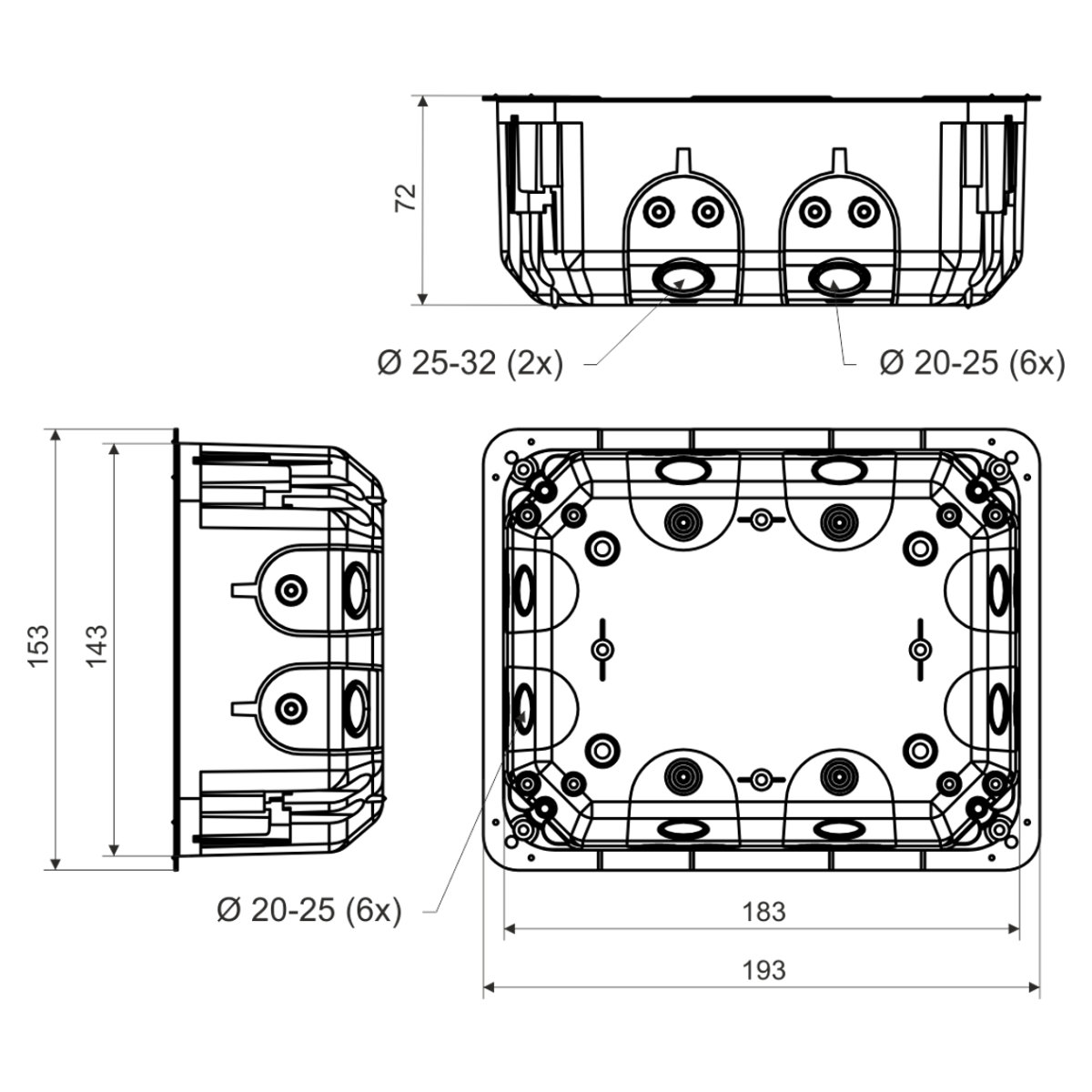 Возможность установки опорной планки TS 35. Снаружи на дне ящика шипы, обозначающие места сверления. Возможность обозначить отверстие для установки с помощью выступов на краю коробки. Входные отверстия из гибкого материала. Монтаж кабеля или трубы осуществляется путем вырывания предварительно запрессованного ввода на гибких мембранах и ввода кабеля или трубы в образовавшееся отверстие. Герметичное проникновение обеспечивается даже при вставленном кабеле или трубе. Препятствует прохождению воздуха через установку. Подходит для энергосберегающих или пассивных домов. При сборке не нужно углублять край гипсокартона. Крепежные винты имеют двойную резьбу для быстрой установки. Охраняется европейским промышленным образцом. Крышку для ящика можно приобрести отдельно как запчасть V 180_HB.