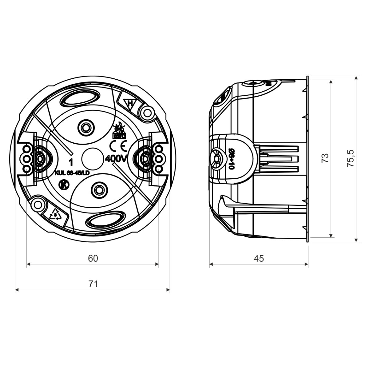 Входные отверстия из гибкого материала. Монтаж кабеля осуществляется путем вырывания предварительно запрессованного ввода на гибких мембранах и ввода кабеля или трубы в образовавшееся отверстие. Герметичное проникновение обеспечивается даже при вставленном кабеле или трубе. Подходит для энергосберегающих или пассивных домов. Крепежные винты имеют двойную резьбу для быстрой установки, в коробке есть пластиковые ножки. Препятствует прохождению воздуха через установку. Степень защиты IP30 обеспечивают коробки с крышкой. При сборке не нужно углублять край гипсокартона.