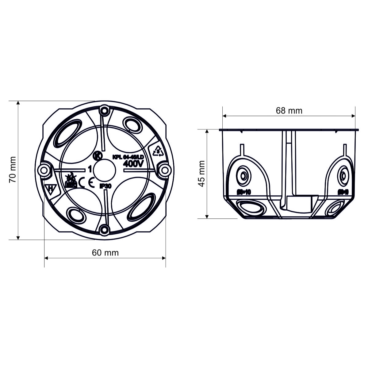 Входные отверстия из гибкого материала. Монтаж кабеля осуществляется путем вырывания предварительно запрессованного ввода на гибких мембранах и ввода кабеля или трубы в образовавшееся отверстие. Установка коробки в отверстие производится путем затягивания крепежных винтов. Герметичное проникновение обеспечивается даже при вставленном кабеле или трубе. Подходит для энергосберегающих или пассивных домов. Крепежные и инструментальные винты имеют двойную резьбу для быстрой установки, коробка содержит пластиковые ножки. При сборке не нужно углублять край гипсокартона. Степень защиты IP30 соответствует коробкам с соответствующей крышкой или устройству со степенью защиты выше или равной IP30. Охраняется европейским промышленным образцом.