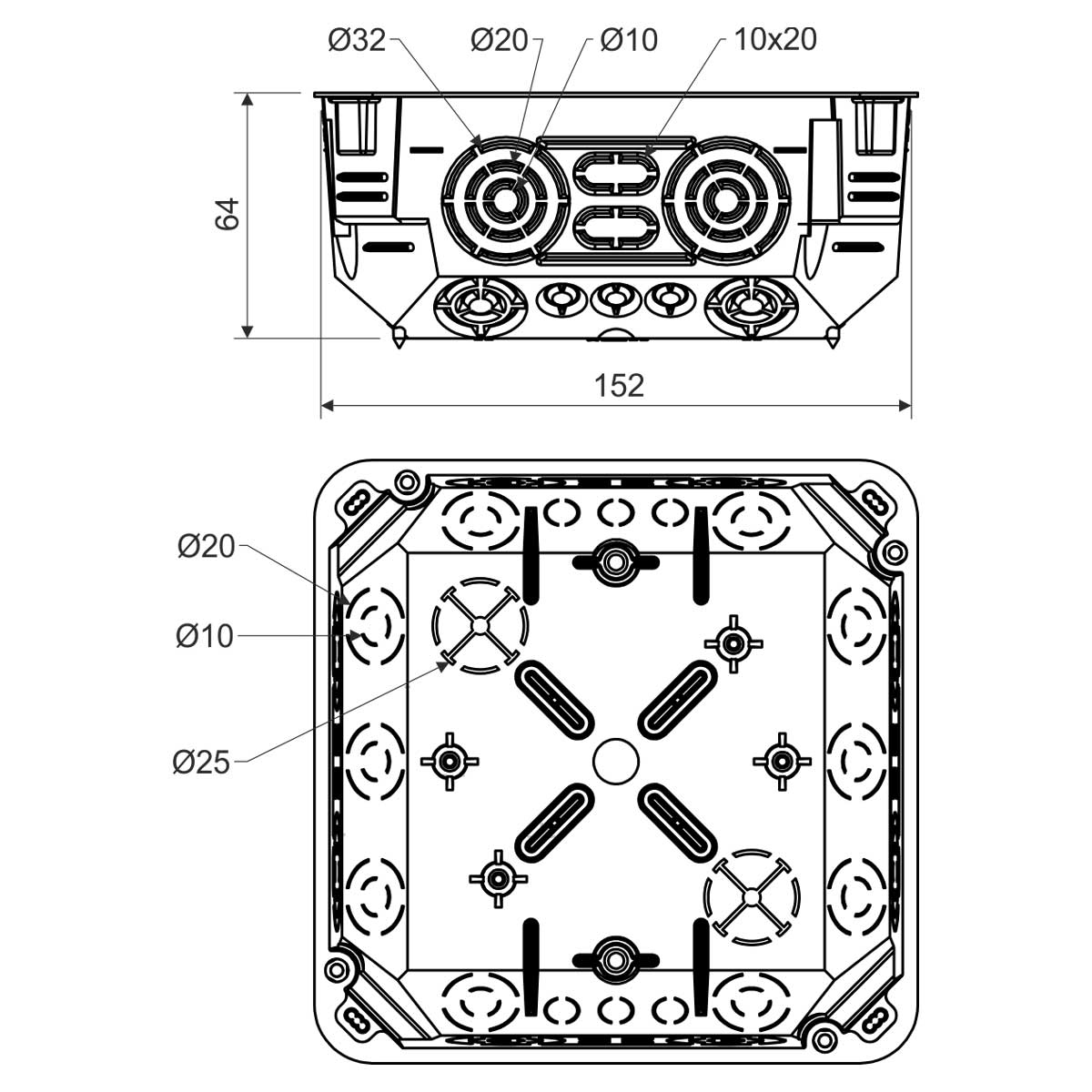 Большое количество проходов для ввода кабелей и труб. Возможность установки опорной планки TS 35. Возможность установки крышки в горизонтальное положение. Возможность разлома всей стороны для облегчения работы с кабелями. На внешней стенке днища имеются шипы для обозначения сверления отверстий. Крепежные винты имеют трехстороннюю резьбу для быстрой установки. Степень защиты IP30 обеспечивают коробки с крышкой.
